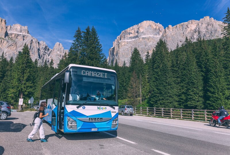 Autobus corriera al Passo Pordoi con destinazione a Canazei | © Patricia Ramirez - Archivio Immagini ApT