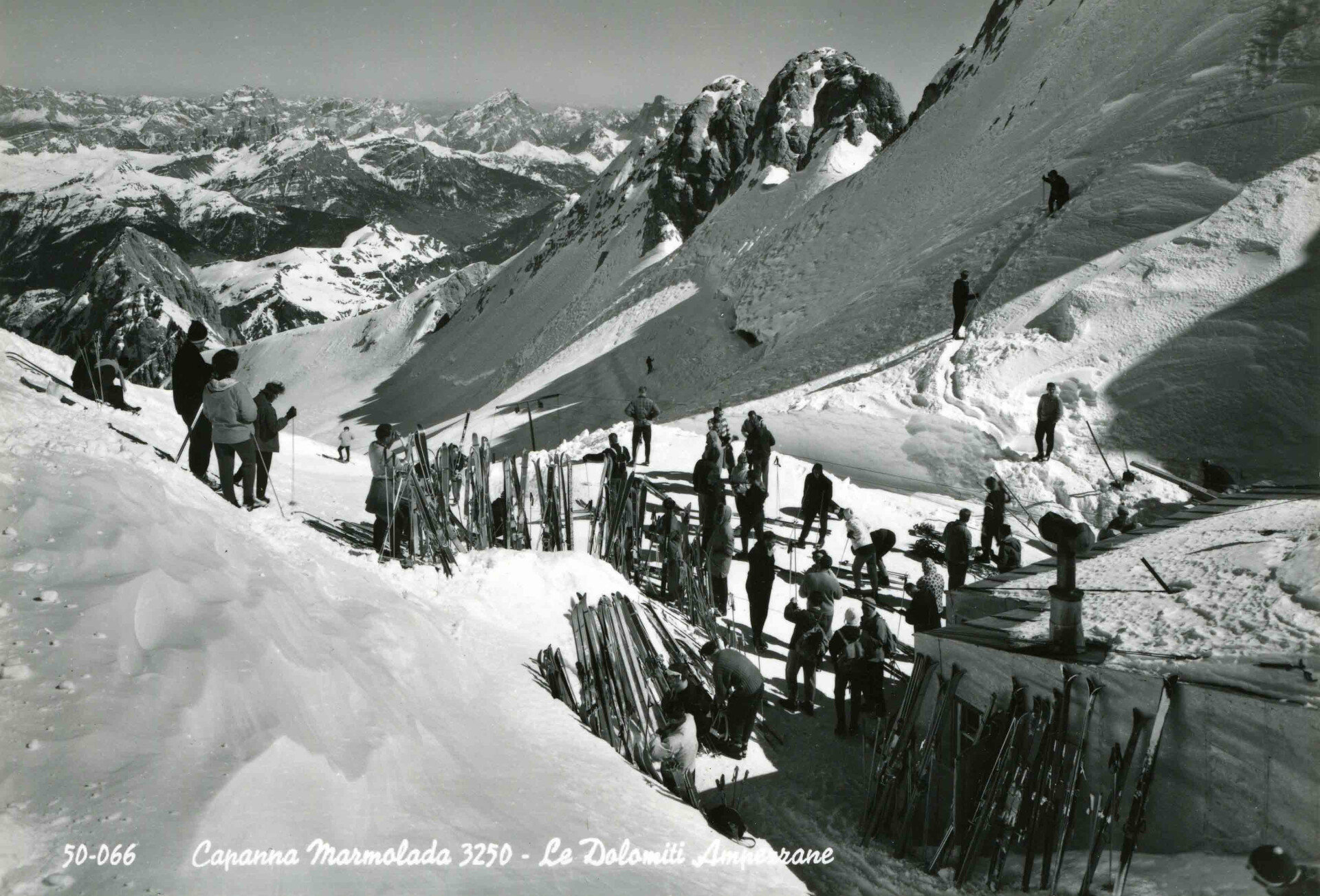 First World War ski route counterclockwise (blue): 78/100 km of which 25/41 km on ski; ski bus sections 36 km. Top slope: the 8 km "Bellunese" slope that descends from the 3,240 m of Punta Rocca along the mountainsides of the Marmolada to Malga Ciapela, with an altitude difference of 1,184 m.